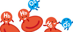 ヘモグロビンは、酸素とくっ付いて酸素を全身へ運ぶ役割を果たしています。