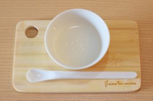 記念すべき最初の一口はアレルギーの心配が少なく、消化に良い、米1に対して10倍の水で炊いた米粥、10倍がゆをあげる。