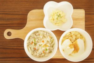 最初は1日1回だった離乳食が1日2回となり、食事に慣れてきた頃、徐々に水分を減らしみじん切りにした食材を食べるようになります。