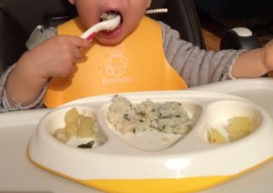 そのうちスプーンに興味を示すようになり、自分で道具を使って食べる練習を始めます。