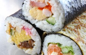作り方は、巻き寿司を作る要領で、巻き簀の上に焼きのりを引き、その上に酢飯を乗せ広げる。準備した7種類の具材を置いて、あとは巻くだけ。