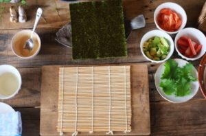 具材以外に準備するものは、巻き簀、焼き海苔、酢飯。