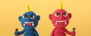 鬼は、上の写真のように頭に角が1本か2本あり、上半身裸で黒と黄色の縞々パンツを履いて、手には金棒を持っている赤や青の大男。