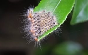 ツバキやサザンカなどの葉の裏に付いている幼虫。